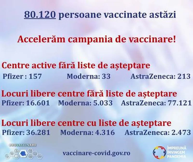 Comitetul de coordonare a vaccinării anunţă accelerarea campaniei de imunizare şi faptul că sunt disponibile 98.755 de locuri în 403 centre fără liste de aşteptare. De asemenea, sunt 571 de centre de vaccinare cu liste de aşteptare unde sunt disponibile peste 43.000 de locuri.