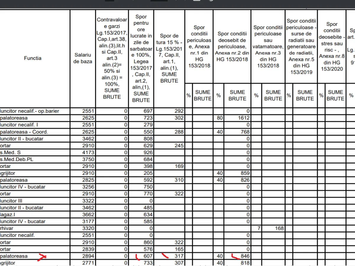 Spălătoreasa câștigă 2.894 lei și spor pentru zile lucrate de sărbătoare (607 lei), spor tură (317 lei) și spor condiții vătămătoare (846 lei).