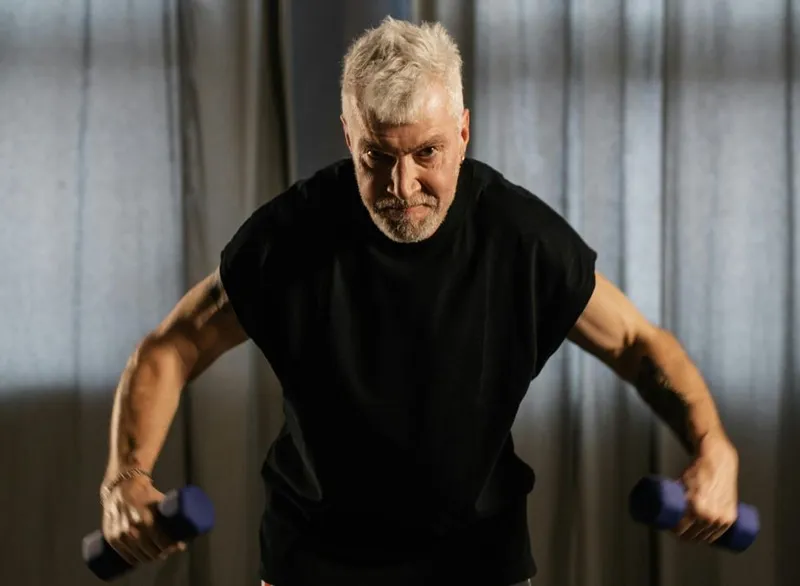 Bărbat în etate ridicând gantere - Foto: Pexels/Alena Darmel