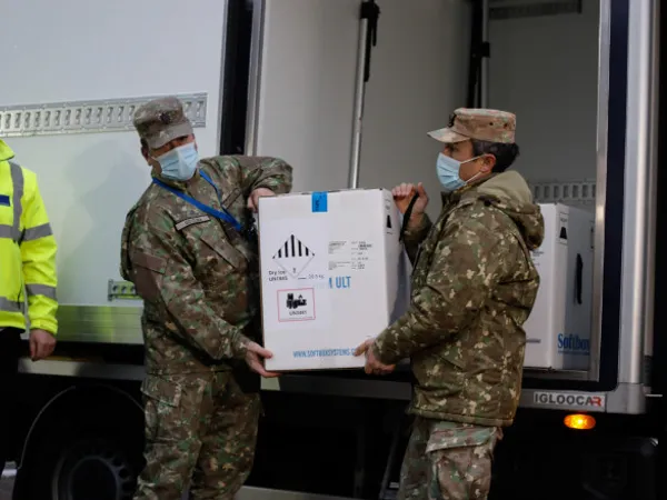 Transportul către centrele de stocare este asigurat de firma producătoare, inclusiv pe cale terestră. Vaccinurile sunt transportate în condiţii optime de siguranţă, în containere speciale, cu gheaţă carbonică şi folie etanşă, precizează informarea transmisă duminică de către CNCAV.