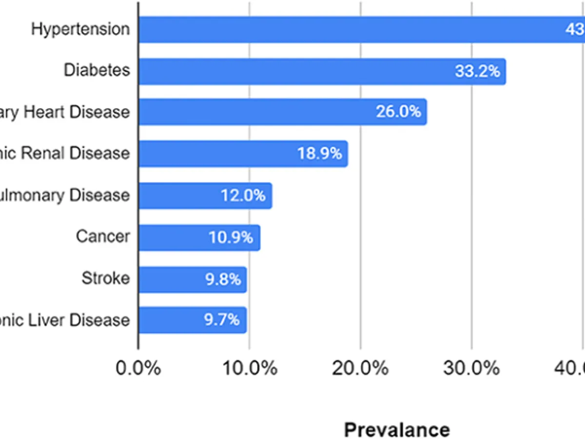 Concret, cea mai răspândită boală în rândul grupului studiat a fost hipertensiunea (43,1%), urmată de diabet (33,2%) și boala coronariană (26,0%).