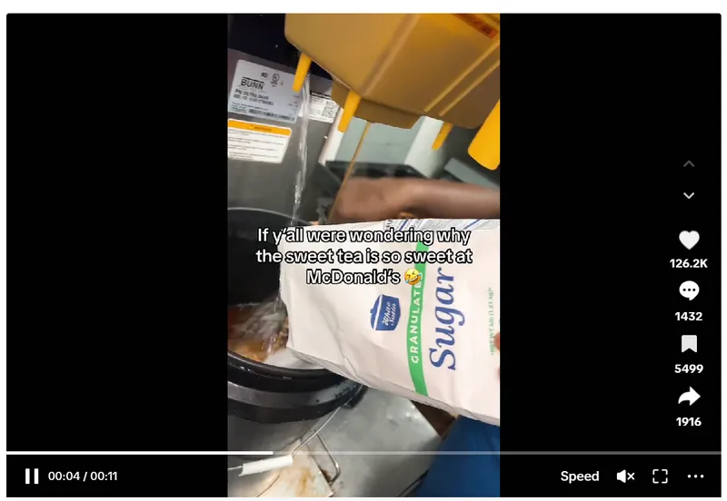 Textul suprapus pe înregistrarea video în care o pungă masivă de zahăr este turnată într-o bază lichidă spune: "Dacă vă întrebați de ce ceaiul dulce este atât de dulce la McDonald's".