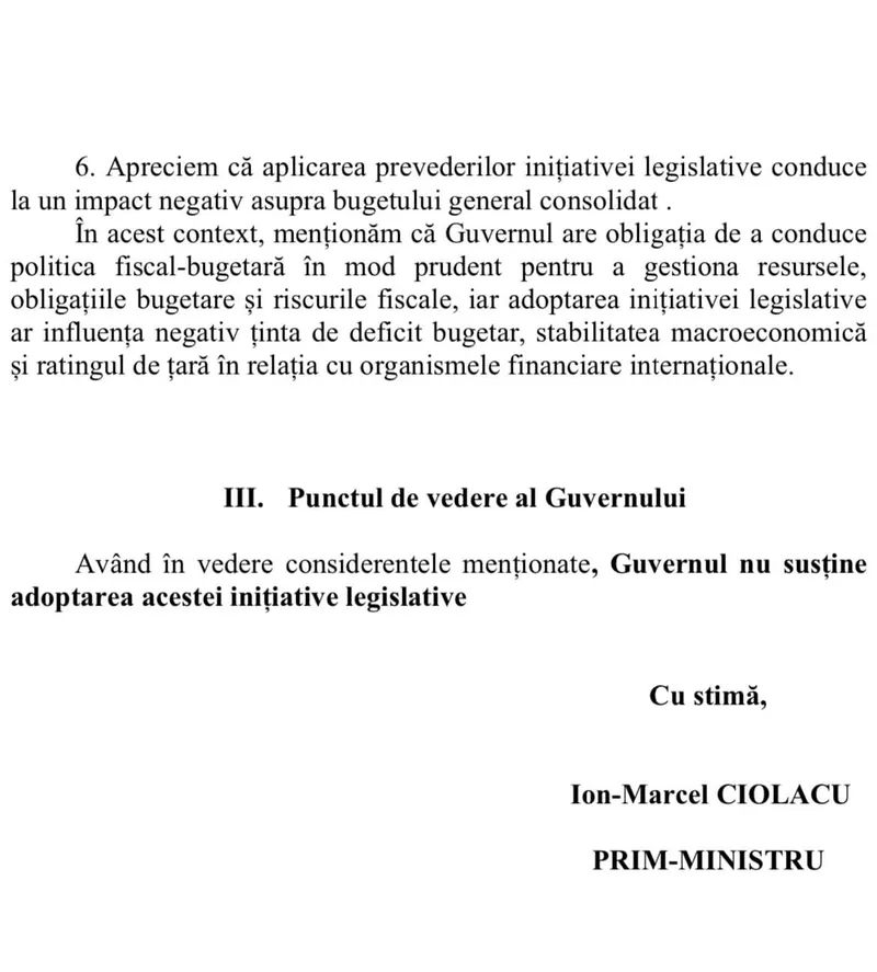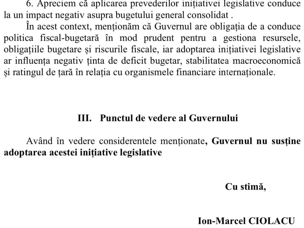 MOTIVUL: Nu mai are bani. Inițiativa ar avea un impact NEGATIV asupra bugetului. Astfel, guvernul NU susține inițiativa.