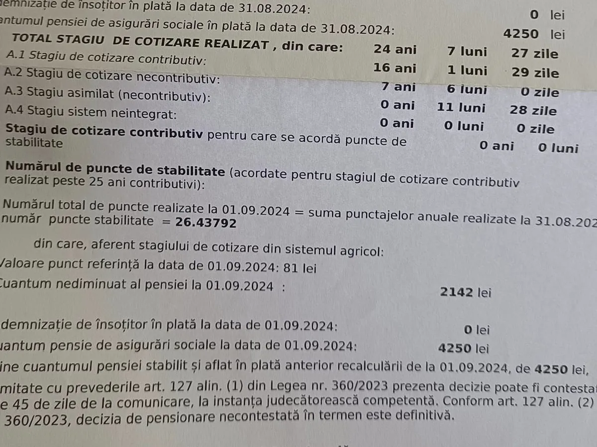 Pensie actuală: 1.281 lei Creștere de pensie de la 1 ianuarie 2025: 153 lei. Pensie finală de la 1 ianuarie: 1.434 lei
