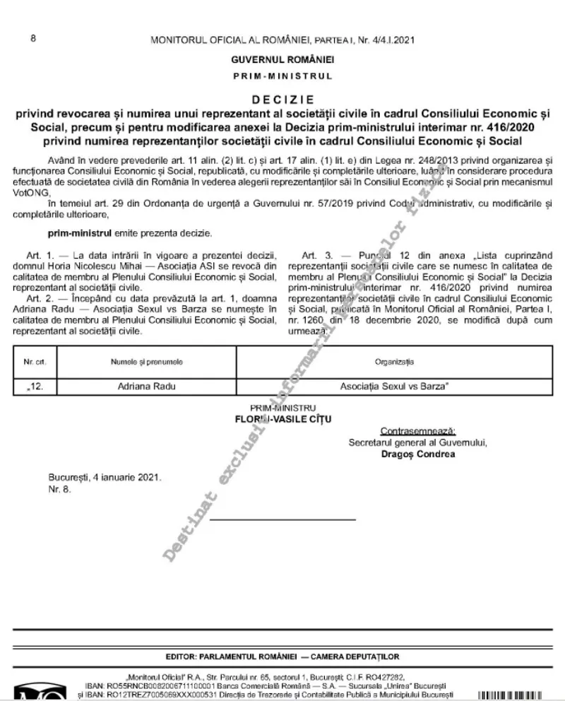 Astfel, „la data intrării în vigoare a prezentei decizii, domnul Horia Nicolescu Mihai - Asociația ASI se revocă din calitatea de membru al Plenului Consiliului Economic și Social. Începând cu data prevăzută la art.1, doamna Adriana Radu - Asociația Sexul vs Braza se numește în calitatea de membru al Plenului Consiliului Economic și Social, reprezentant al societății civile”.