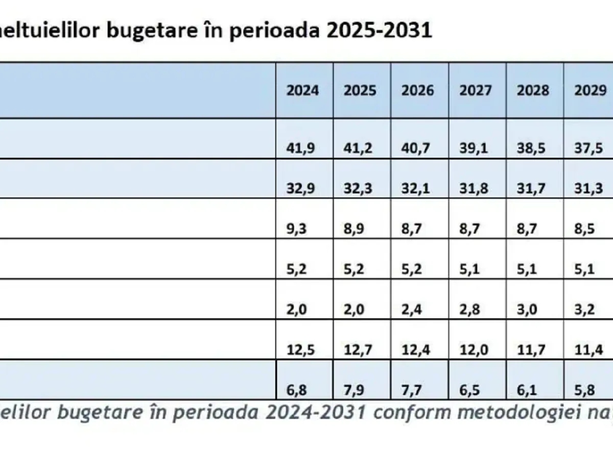 Vizate pentru tăieri sunt în special cheltuielile cu salariile bugetarilor, exprimate ca procent din PIB, care ar urma să scadă de la o pondere de 9,3% din PIB în 2024 la 8,3% în 2031, precum și cheltuielile cu pensiile și alte beneficii de natura asistenței sociale. Acestea din urmă ar trebui să scadă de la o pondere de 12,7% din PIB în 2025 la 10,7% în 2031. Vorbim nu doar despre cheltuielile cu pensiile, ci despre o limită pentru toate cheltuielile cu asistența socială, din care mare parte sunt, într-adevăr, pensii, arată cursdeguvernare