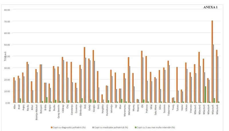 Raportul mai arată și care sunt centrele unde copiii au fost internați de cel puțin trei ori: în Sectorul 3, din cei 233 de copii, 61 au medicație psihiatrică, iar 33 au fost internați de matrei sau mai multe ori în spitale de psihiatrie. Cu toate acestea, raportul nu explică ce se întâmplă cu acești copii sau care sunt motivele pentru care au primit medicația.
