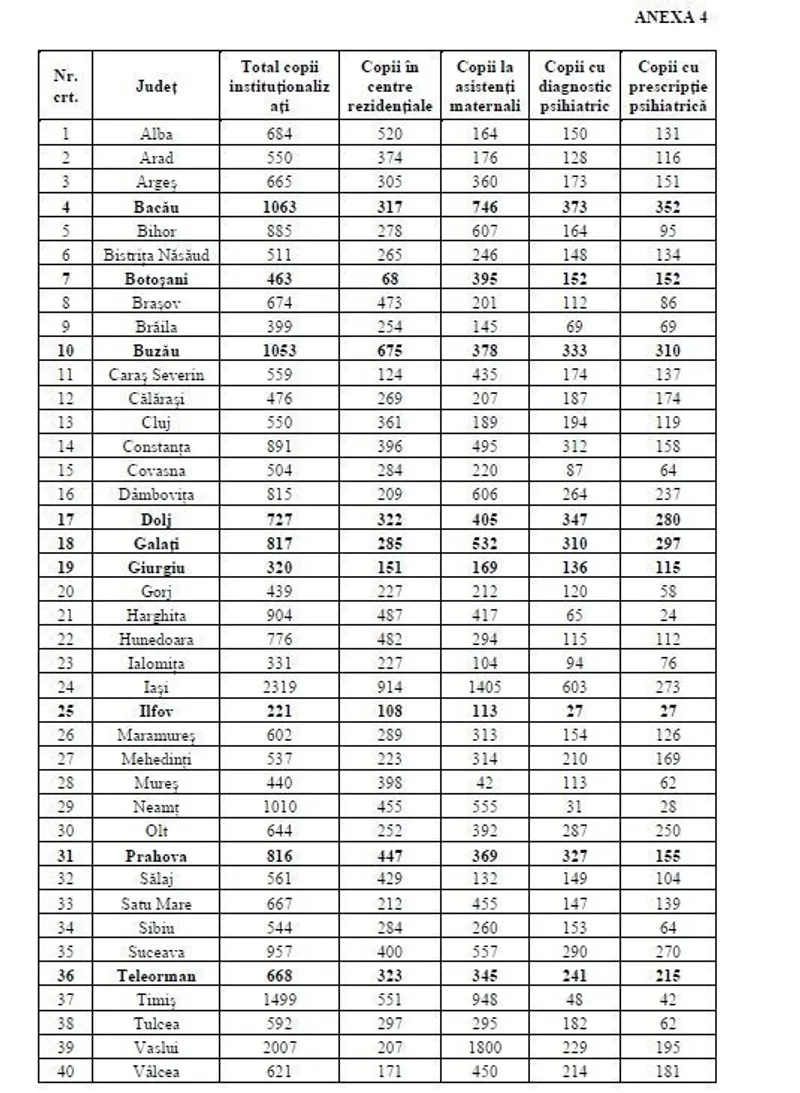 Județele unde sunt cei mai mulți copii care primesc medicație psihiatrică sunt: Bacău – 352 de copii, Buzău – 310 de copii, Galați – 297 de copii. Similar, raportul nu menționează de ce atât de mulți copii primesc medicația psihiatrică.