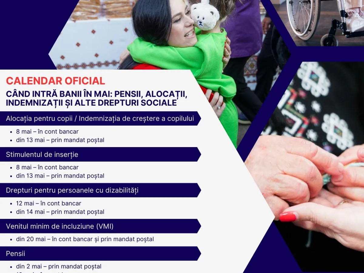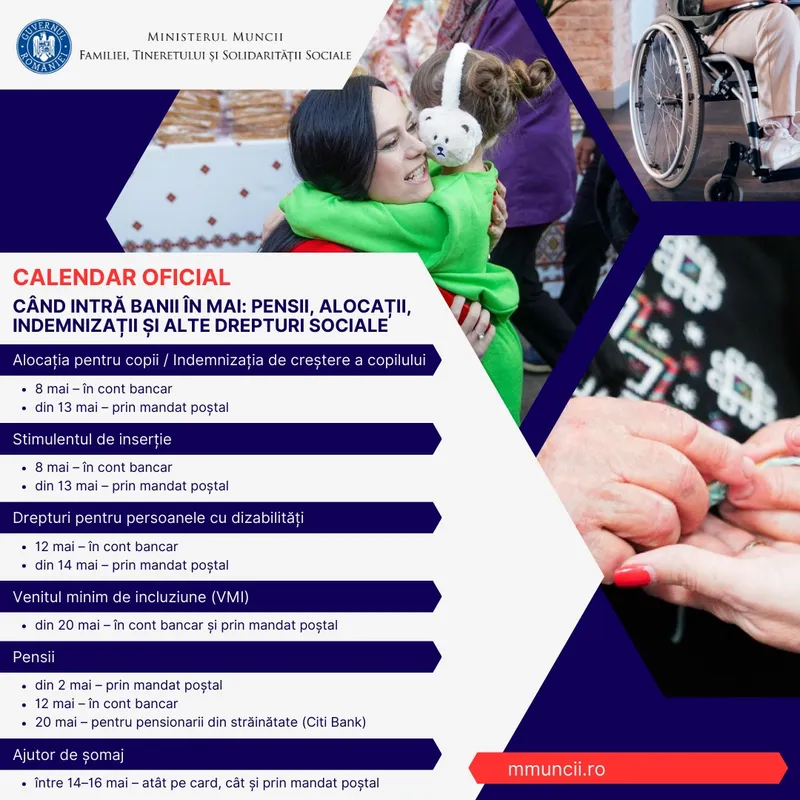 Ajutorul pentru susținerea familiei (VMI): 20 MAI în cont bancar; începând cu 20 MAI prin mandat poștal;