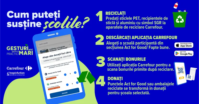 Cum? Reciclați sticlele PET, recipientele de sticlă și aluminiu cu simbol SGR si predați-le la aparatele de reciclare Carrefour. Descărcați aplicația Carrefour din App Store sau Google Play. Alegeți o grădiniță sau școală participantă din secțiunea Act for Good. Donați punctele după scanarea bonurilor primite de la aparatul de reciclare. Fiecare donație contează!