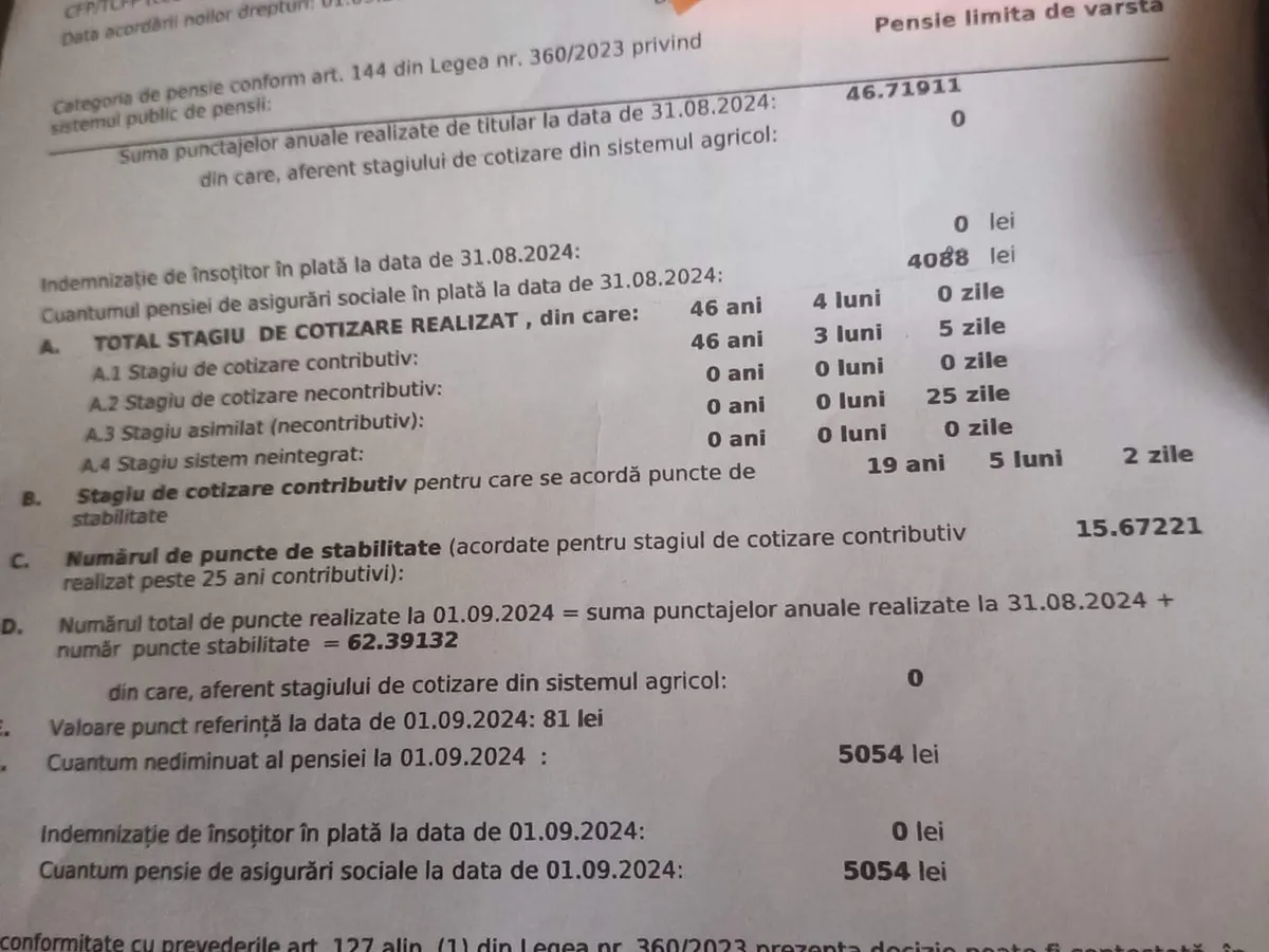 În alt exemplu pe care îl vedeți mai jos, o pensie a crescut de la 4.000 de lei la 5.054 după 40 de ani de muncă. pensionarul are 62 de puncte de contributivitate și 11 ani de puncte de stabilitate.