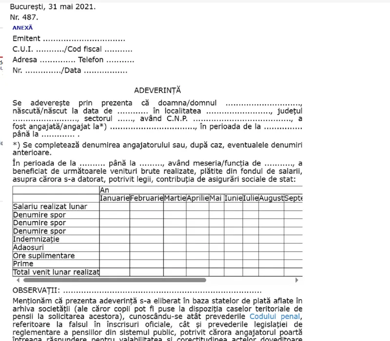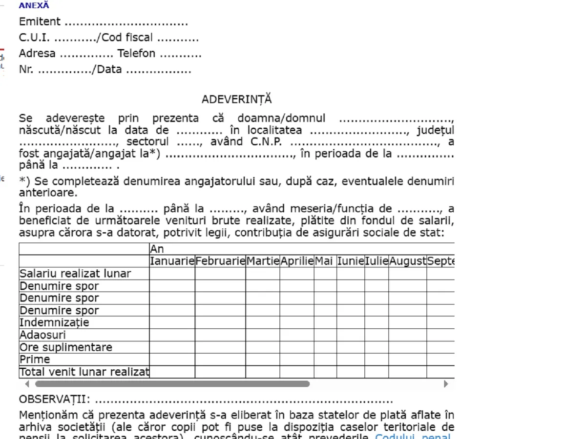 Așa arată modelul de adeverință în care trebuie trecute orele supliemnatre, indemnziațiile, priemle și, evident, salariul realizat. Acestea trebuie consemnate de către angajator. Pensionarul este cel care trebuie să le obțină de la angajator, deși au trecut deja 20 de ani.