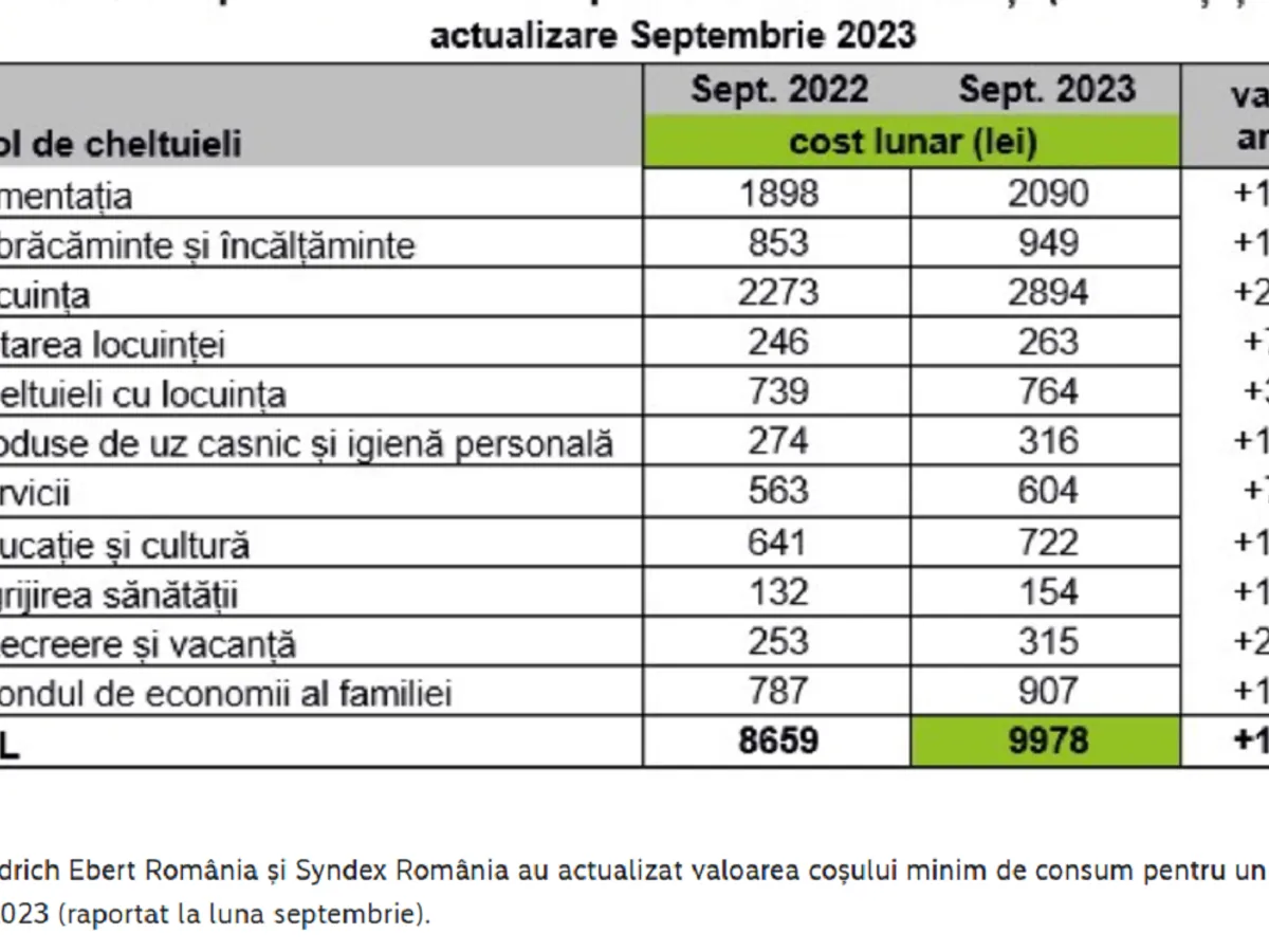 Valoarea coșului minim de consum pentru un trai decent pentru o familie de doi adulți și doi copii este de 9978 lei pe lună. Valoarea coșului pentru o familie de doi adulți și un copil este de 8205 lei pe lună, pentru o familie de doi adulți fără copii este de 6162 lei pe lună, iar pentru o persoană adultă singură este de 3807 lei pe lună.