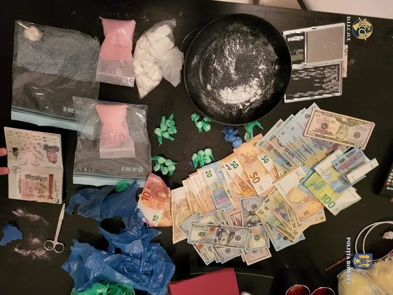 Poliţiştii au făcut apoi o percheziţie în locuinţa respectivă şi au găsit aproximativ 280 de grame de cocaină şi 21 de grame de ketamină, mai multe instrumente destinate cântăririi, porţionării şi ambalării drogurilor, precum şi sume de bani în lei şi euro, despre care anchetatorii bănuiesc că provin din traficul de droguri.