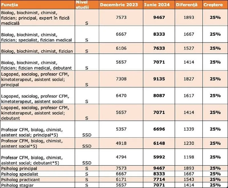 Astfel, un biochimist cu studii superioare care în decembrie 2023 avea un salariu de 7.573 de lei, în iunie 2024 va avea 9.467 de lei, cu 1.890 de lei mai mult, având o creștere de 25%.