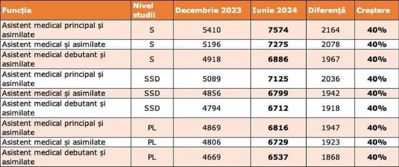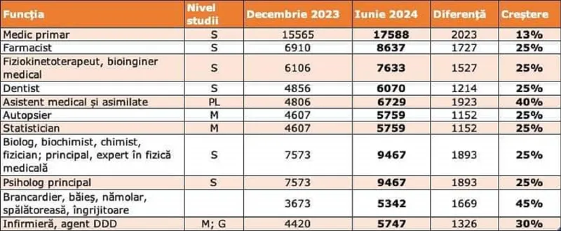 Sunt însă creșteri de până la 40% pentru asistenți medicali, 30% pentru infirmieri și 45% pentru brancardieri și îngrijitori.