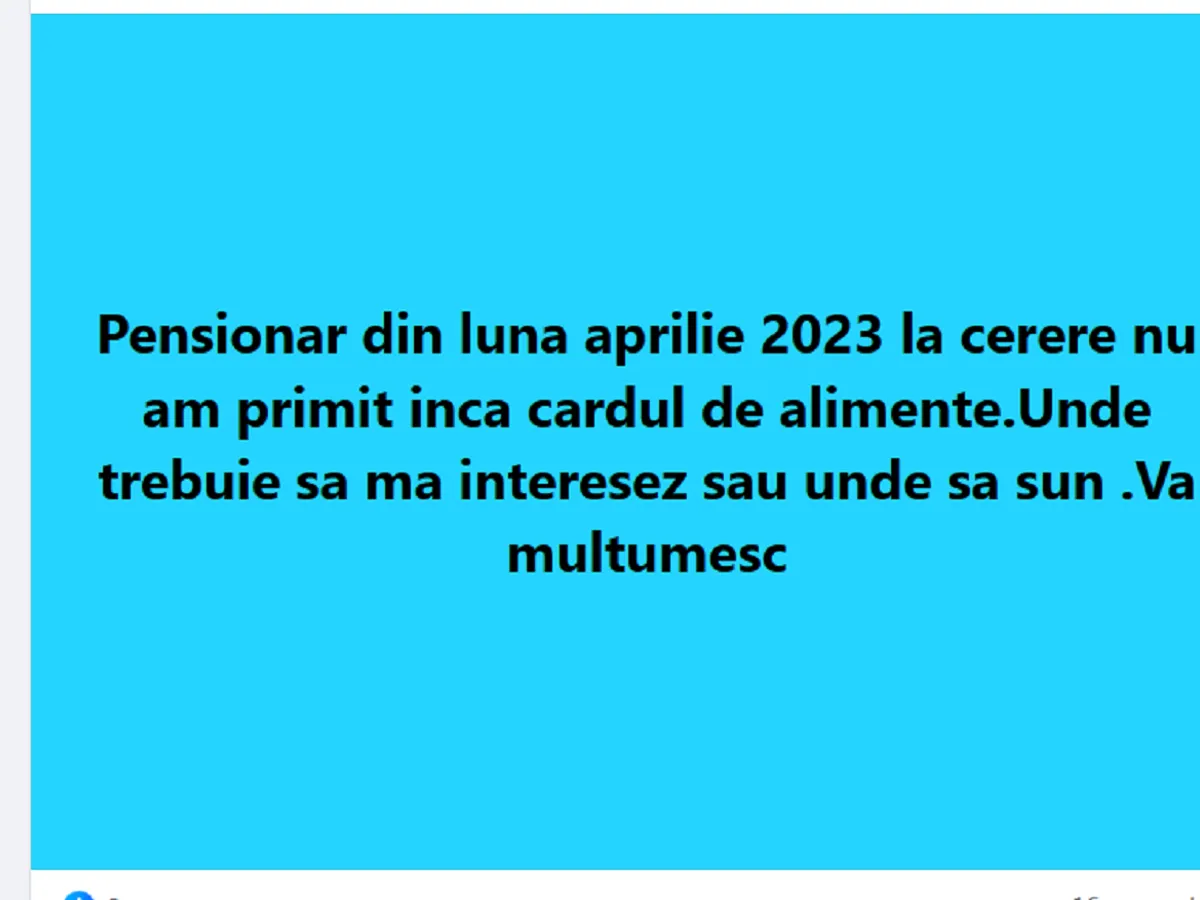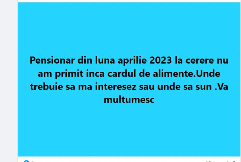 Un alt participant la grup a oferit și o posibilă explicație: Veniturile din 2023 ar depăși plafonul de 1.700 de lei (cardurile se dau pensionarilor cu venituri sub 1.700 lei n. red.). „Din aprilie am ieșit și eu. Sunt în aceeași situație, dar am sunat la casa de pensii și mi-a spus că s-au adăugat salariile din lunile din urmă și depășesc 1700 lei. Poate din decembrie.”