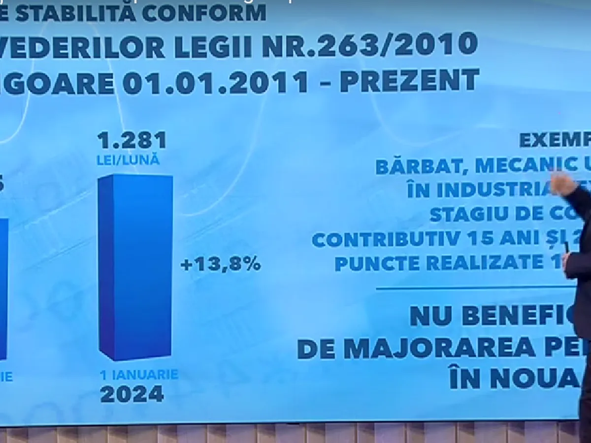 Președintele Casei Naționale de Pensii a și explicat acest lucru la Antena 3 dând un exemplu maximal de creștere de pensie. El a dat exemplu unui mecanic care a lucrat pe salariul minim, dar asta timp de 36 de ani.