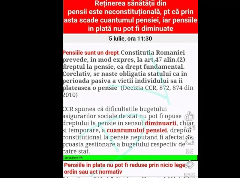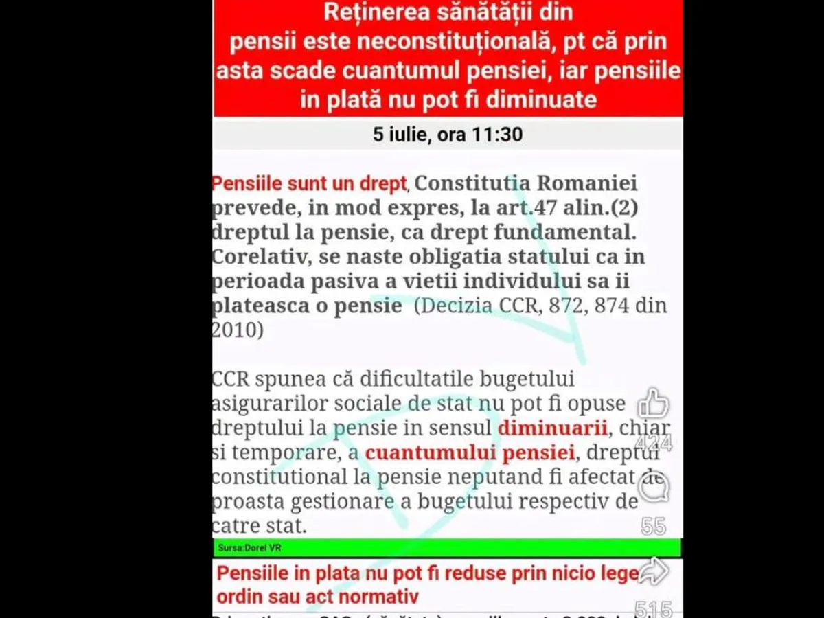 „Aplicarea CASS la pensiile peste 3000 de lei nu este, cumva, ilegală? Pensiile contributive sunt plătite de stat ca urmare a sumelor plătite de fiecare pensionar de-a lungul vieții. Nu reprezintă un venit, ci o plată eșalonată a banilor de care statul s-a folosit. Părerea mea”, a scris un pensionar.