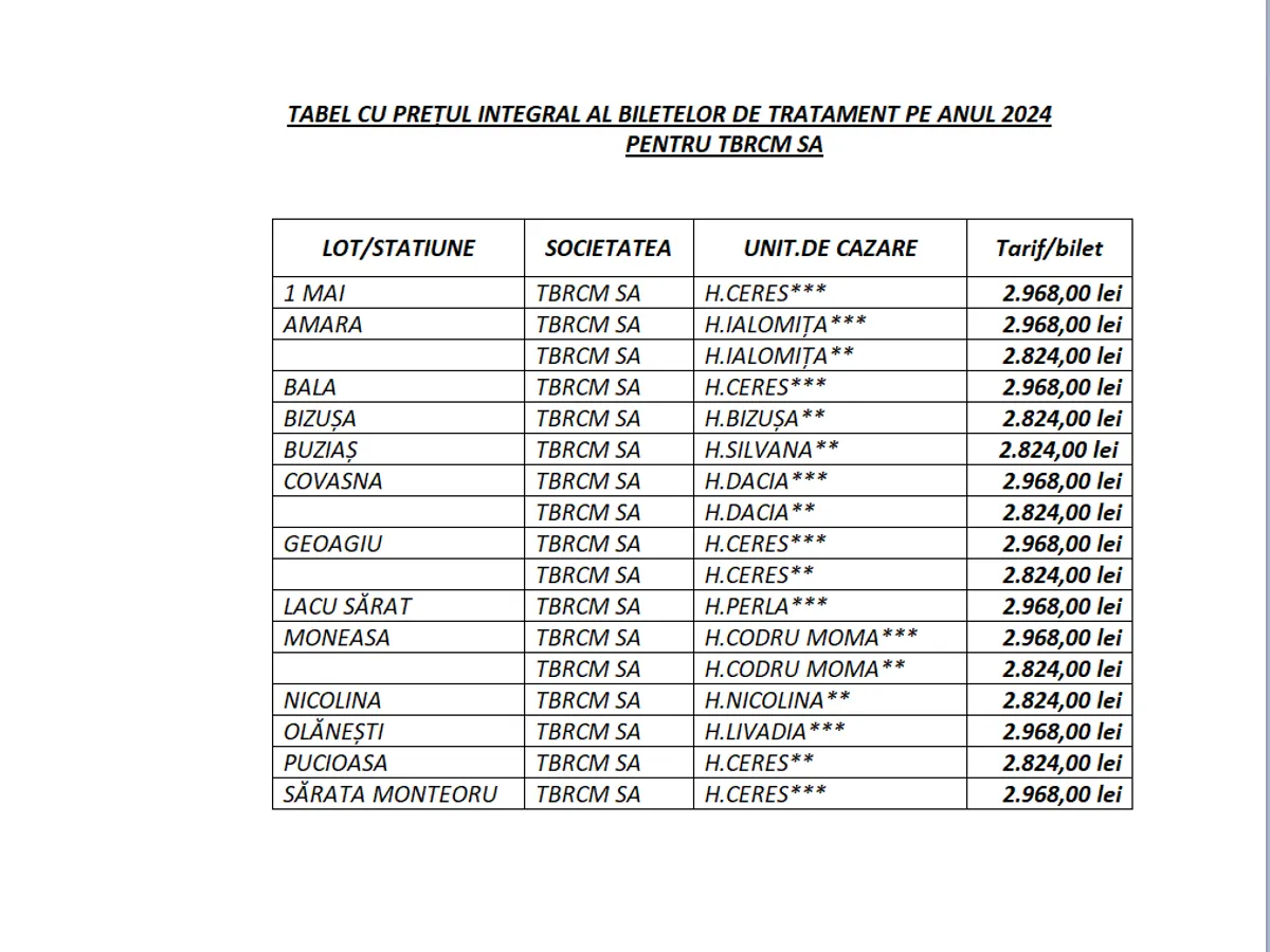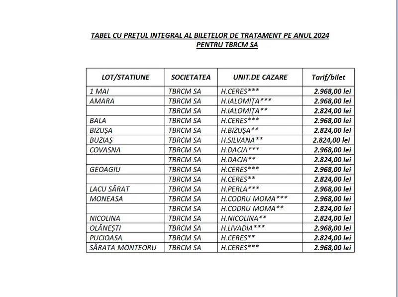 Este vorba de 16 zile de cazare și 12 de tratament. După cum se vede, cel mai scump este un sejur la „1 Mai” unde se plătește 2.968 de lei, la fel ca la Amara, Covasna, Moneasa, Sărata Monteoru.