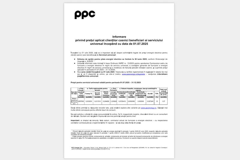 Iar doi dintre cei mai mari furnizori de energie electrică din România, PPC (fosta Enel) și Electrica Furnizare, au anunțat deja noile tarife valabile între 1 iulie 2025 și 31 decembrie 2025: 1,57 lei/kWh.