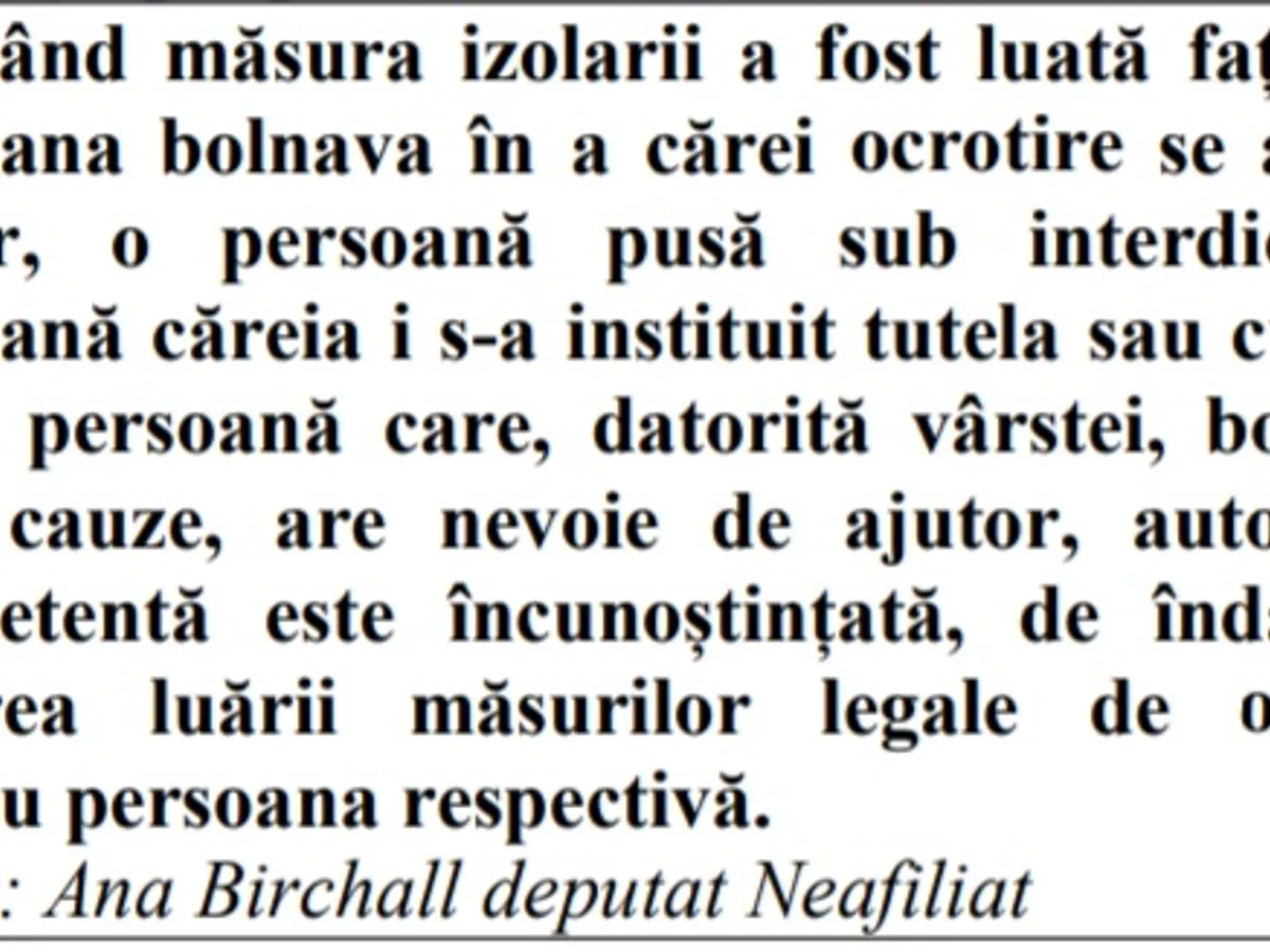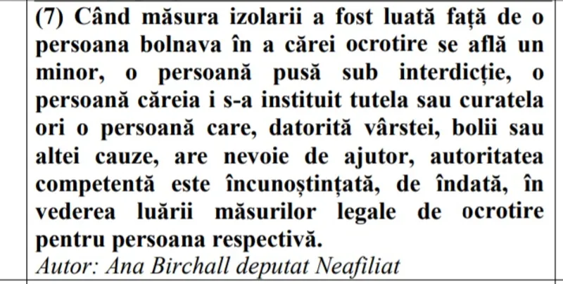 Un amendament introdus în lege de deputatul Ana Birchall menționează: „Când măsura izolarii a fost luată față de o persoană bolnavă, în a cărei ocrotire se află un minor, o persoană pusă sub interdicție, o persoană căreia i s-a instituit tutela sau curatela ori o persoană care, datorită vârstei, bolii sau altei cauze, are nevoie de ajutor, autoritatea competentă este încunoștințată, de îndată, în vederea luării măsurilor legale de ocrotire pentru persoana respectivă”.