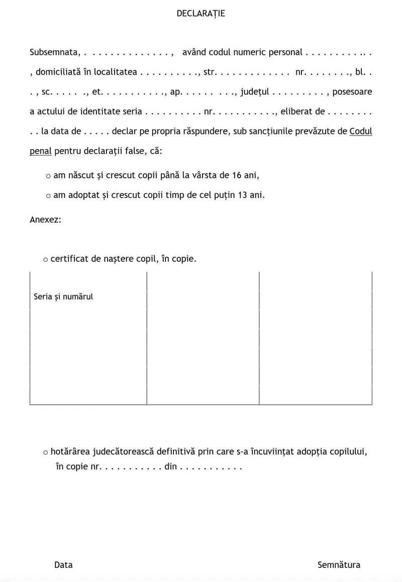 •declaraţia pe propria răspundere că au născut și crescut copii până la vârsta de 16 ani, respectiv au adoptat și crescut copii timp de cel puțin 13 ani (model de declarație).