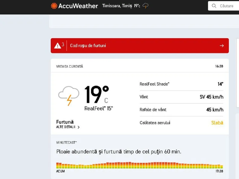 La ora aceasta, în Timişoara sunt 19 grade Celsius, e ploaie abundentă şi furtună timp cel puţin 60 de minute, cu rafale de vânt de 45 km/h.