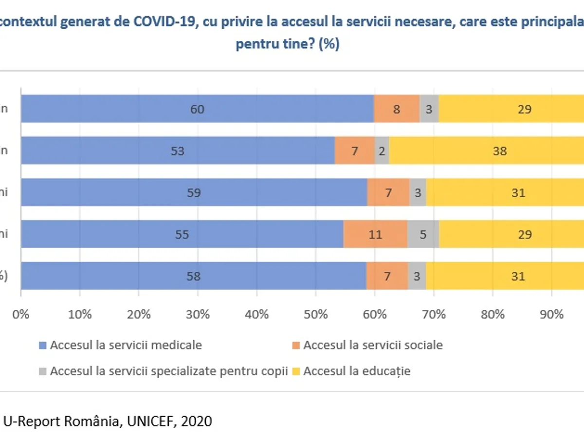 În ceea ce privește accesul la servicii, copiii au vorbit despre lipsa accesului la servicii medicale - 58% și la educație - 31%.