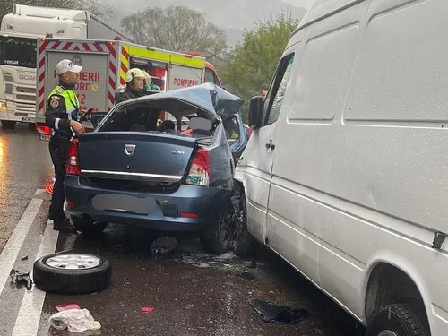 Accidentul s-a produs sâmbătă, în jurul orei 16:00, pe DN7, la kilometrul 221 +400 de metri, în localitatea Racoviţa din judeţul Vâlcea, unde un autoturism şi o autoutilitară s-au ciocnit violent.