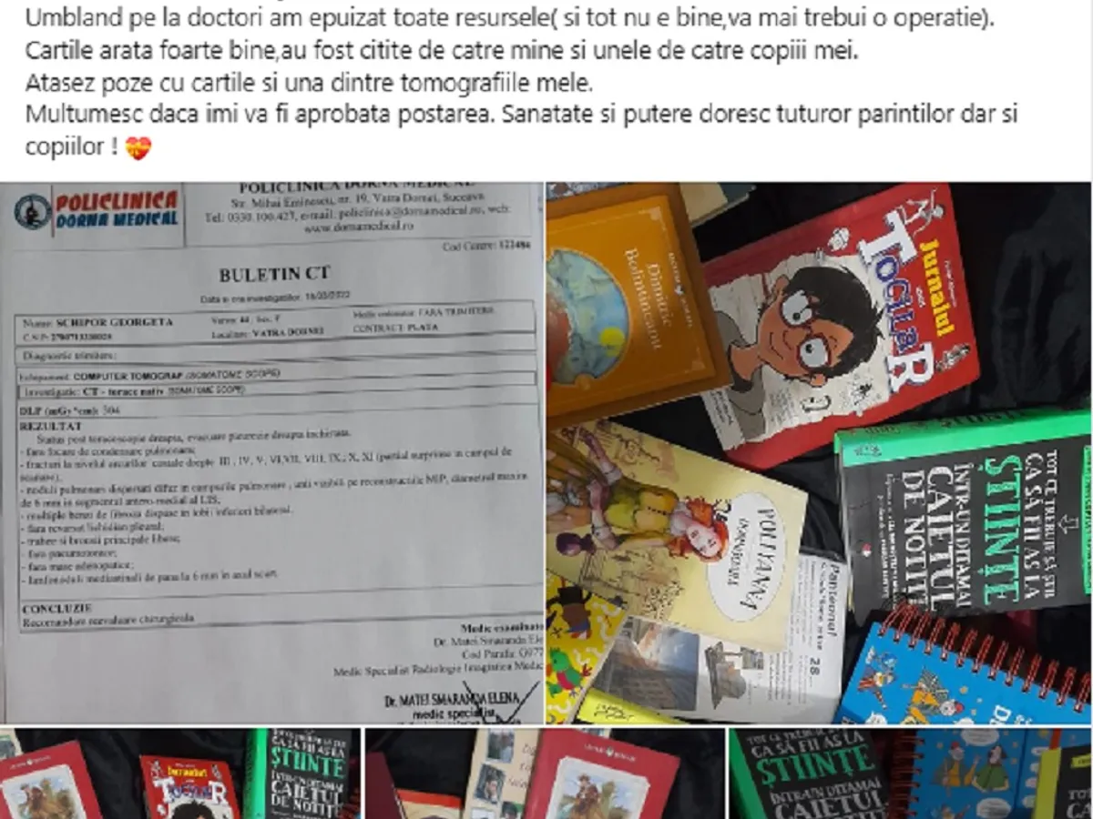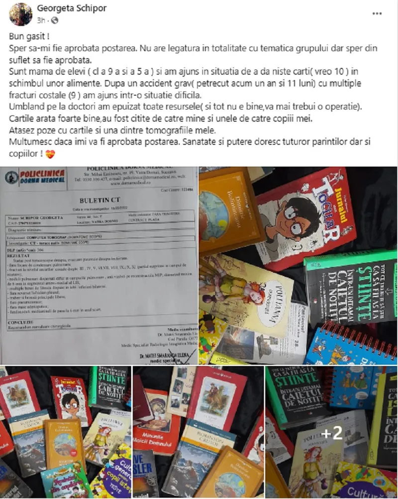 ”Sunt mamă de elevi ( cl a 9 a și a 5 a ) și am ajuns în situația de a da niște cărți ( vreo 10 ) în schimbul unor alimente. După un accident grav ( petrecut acum un an și 11 luni) cu multiple fracturi costale (9 ) am ajuns într-o situație dificilă.