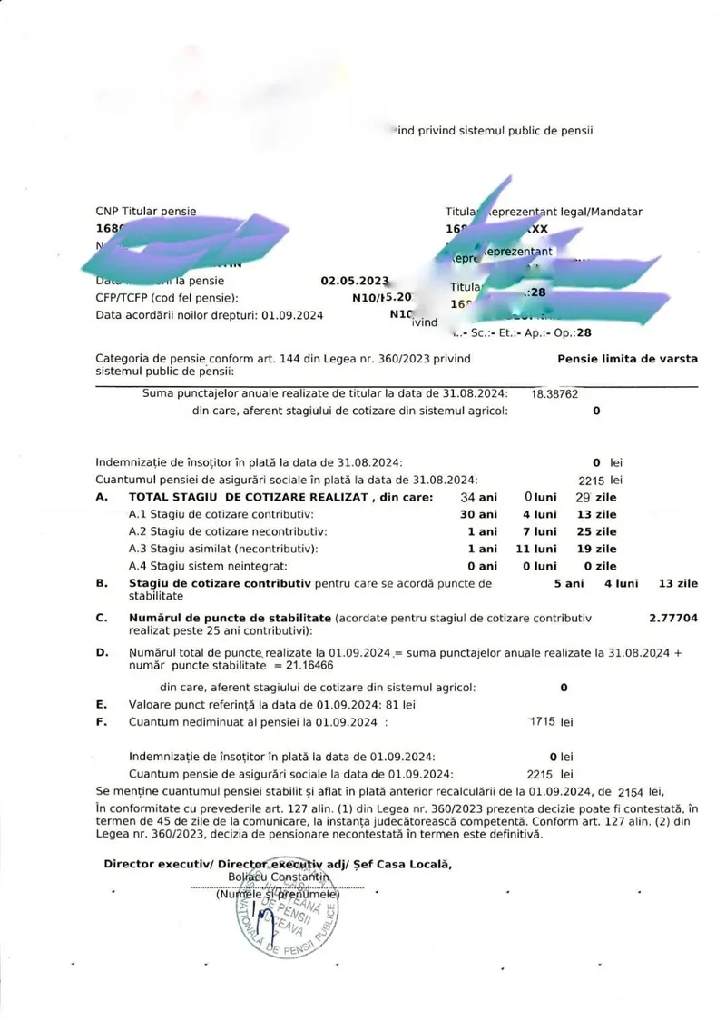 Potrivit documentului emis de Casa de Pensii, în urma recalculării, noua valoare a pensiei este de doar 1.715 lei, ceea ce înseamnă o reducere de 439 lei față de pensia anterioară.