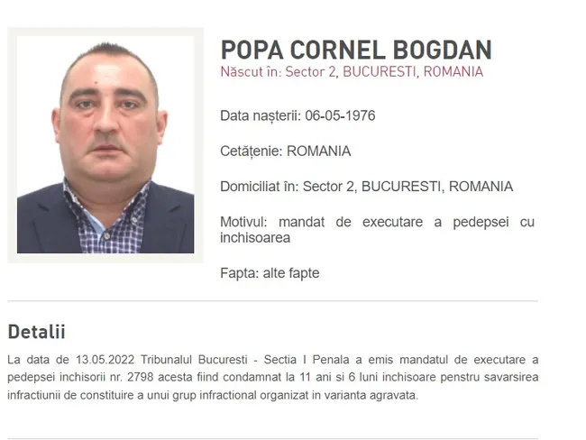"Astăzi, 13 mai 2022, în urma deciziei instanţei, Serviciul Investigaţii Criminale din Poliţia Capitalei a pus în aplicare un mandat privind condamnarea la pedeapsa cu închisoarea de 11 ani şi 6 luni, emis pe numele unui bărbat. Acesta nu a fost găsit la domiciliu sau la adresele cunoscute, fapt pentru care a fost dispusă punerea în urmărire, fiind emis şi mandat european de arestare", transmite Poliţia Română, care a publicat la rubrica 'Persoane urmările' o poză cu Bogdan Popa.