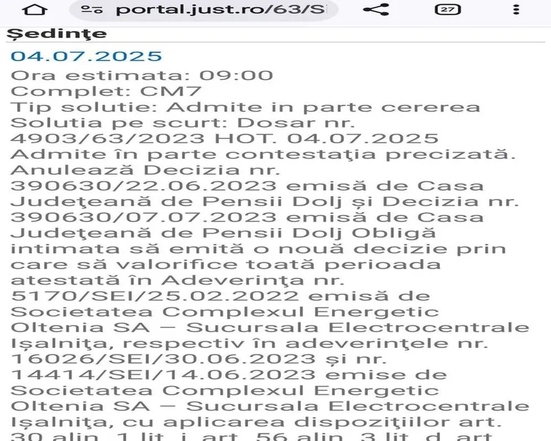 „Hotărârea Tribunalului Dolj din data de 4 iulie 2025, împreună cu decizia de punere în aplicare emisă pe 30 iulie 2025, conform art. 448, alin. 1, pct. 4 din Noul Cod de Procedură Civilă, se referă la recalcularea pensiei pe condiții speciale de muncă, realizată de Casa de Pensii Dolj. Astfel, recalcularea este posibilă în baza acestei decizii. Deci se poate...”, a spus pensionarul pe un forum de pensii.