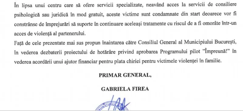 „La nivelul municipiului București, serviciile rezidențiale destinate victimelor violenței în familie sunt asigurate prin intermediul centrelor de primiri urgențe și organizațiilor neguvernamentale, însumând un număr total de locuri de aproximativ 100, cu mult sub standardele minime și indicațiile europene, conform cărora la populația Municipiului București (2.106.144 de locuitori) ar trebui să existe cel puțin 200 de locuri disponibile în astfel de centre”, arată Gabriela Firea, în expunerea de motive a programului „Împreună”.