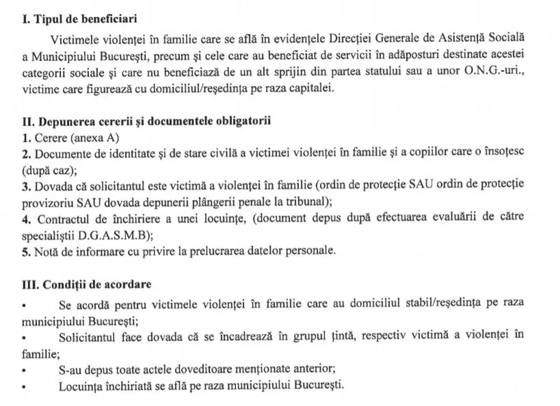 Proiectul se va derula anul acesta și se adresează victimelor violenței domestice aflate în evidența Direcției Generale de Asistență Socială a Capitalei, dar și a celor care au beneficiat de servicii în adăposturi. Victimele trebuie să „nu beneficieze de un alt sprijin din partea statului sau a unor ONG-uri”. Ele ar trebui să aducă o dovadă că sunt victime ale violenței în familie – să aibă „un ordin de protecție emis de instanță, un ordin provizoriu (prin care oricum agresorul este scos din locuință, n.red.) sau dovada depunerii plângerii la tribunal” (nu există plângere înregistrată la tribunal, ci la poliție, n.red.) -, precum și un contract de închiriere a unei locuințe. Victima mai trebuie să treacă și de o evaluare a Direcției Generale de Asistență Socială.
