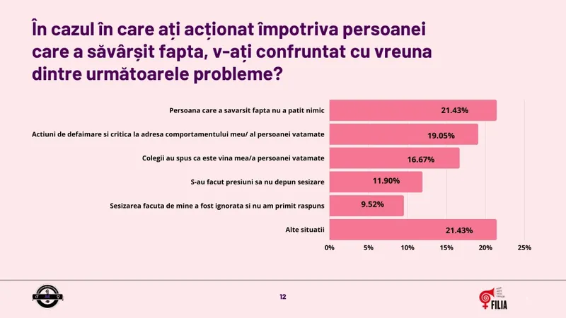 Dintre cei care și-au denunțat hărțuitorul, în 21,4 la sută din cazuri, acesta nu a pățit nimic, iar peste 19 la sută povestesc că au fost defăimați de hărțuitor. Peste 16,6 la sută au fost acuzați de colegi că este vina victimei că a fost hărțuită. În 11,9 la sută dintre cazuri, victimele spun că s-au fpcut presiuni asupra lor să nu depună sesizare, iar în 9,5 la sută din cazuri – că sesizarea pe care au făcut-o a fost ignorată și nu au primit nici un fel de răspuns.