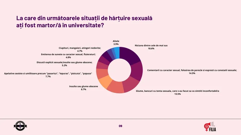 Dintre ei care au răspuns că au fost hărțuiți, peste 15 la sută vorbesc despre expunere indecentă a unor părți ale coprului sau contact fizic sexual explicit, iar aproape 30 la sută spun că au fost martori la comentarii cu caracter sexual, folosirea de porecle și expresii cu conotații sexuali sau glume cu tentă sexuală, care le-au făcut să se simtă inconfortabil.