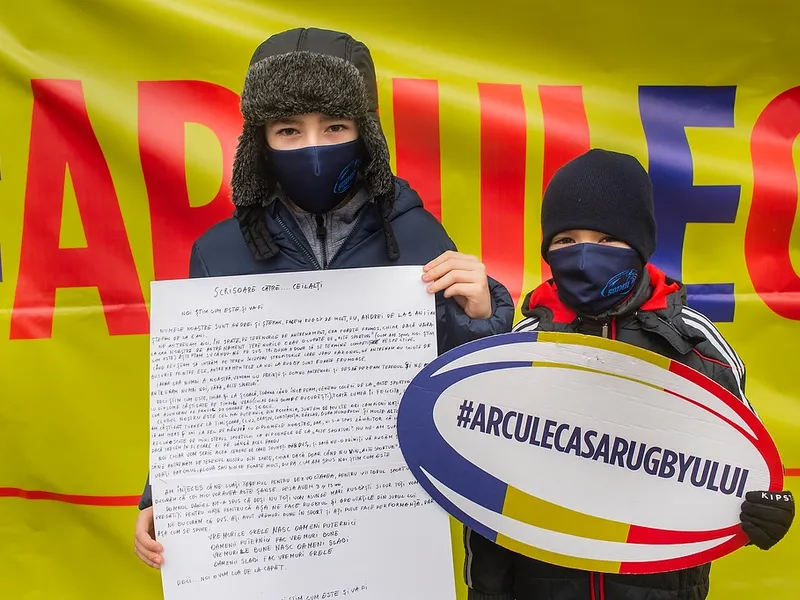 Doi frați, de 7 și de 13 ani, care nu se mai pot juca pe Stadionul de Rugby Arcul de Triumf, cu toate că arena este gata, au venit la protestul rugby-știlor față de decizia ministrului UDMR, Eduard Novak, cu un mesaj emoționant.