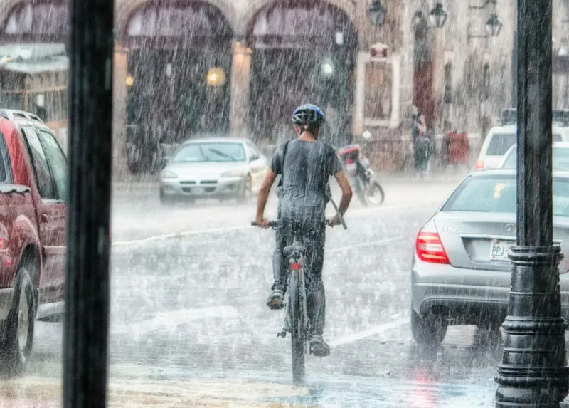 Tânăr pedalând pe biciletă, pe carosabil, pe o ploaie torenţială - Foto: Pexels/Genaro Servín