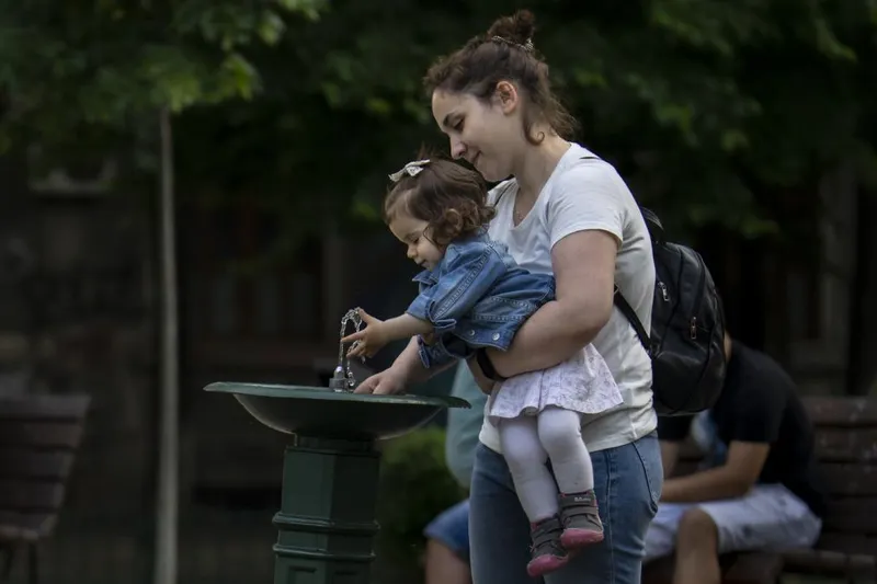Femeie cu copil lângă o ţâşnitoare, în Bucureşti - Foto: Profimedia Images