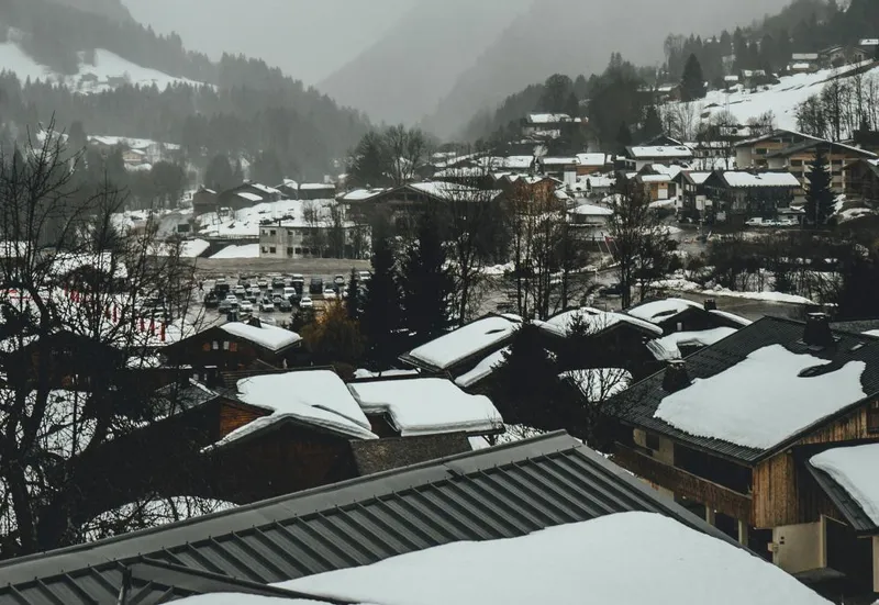 Imagine aeriană cu case, oraş de munte. Frig, zloată, ninsoare - Foto: Pexels/Guillaume Hankenne