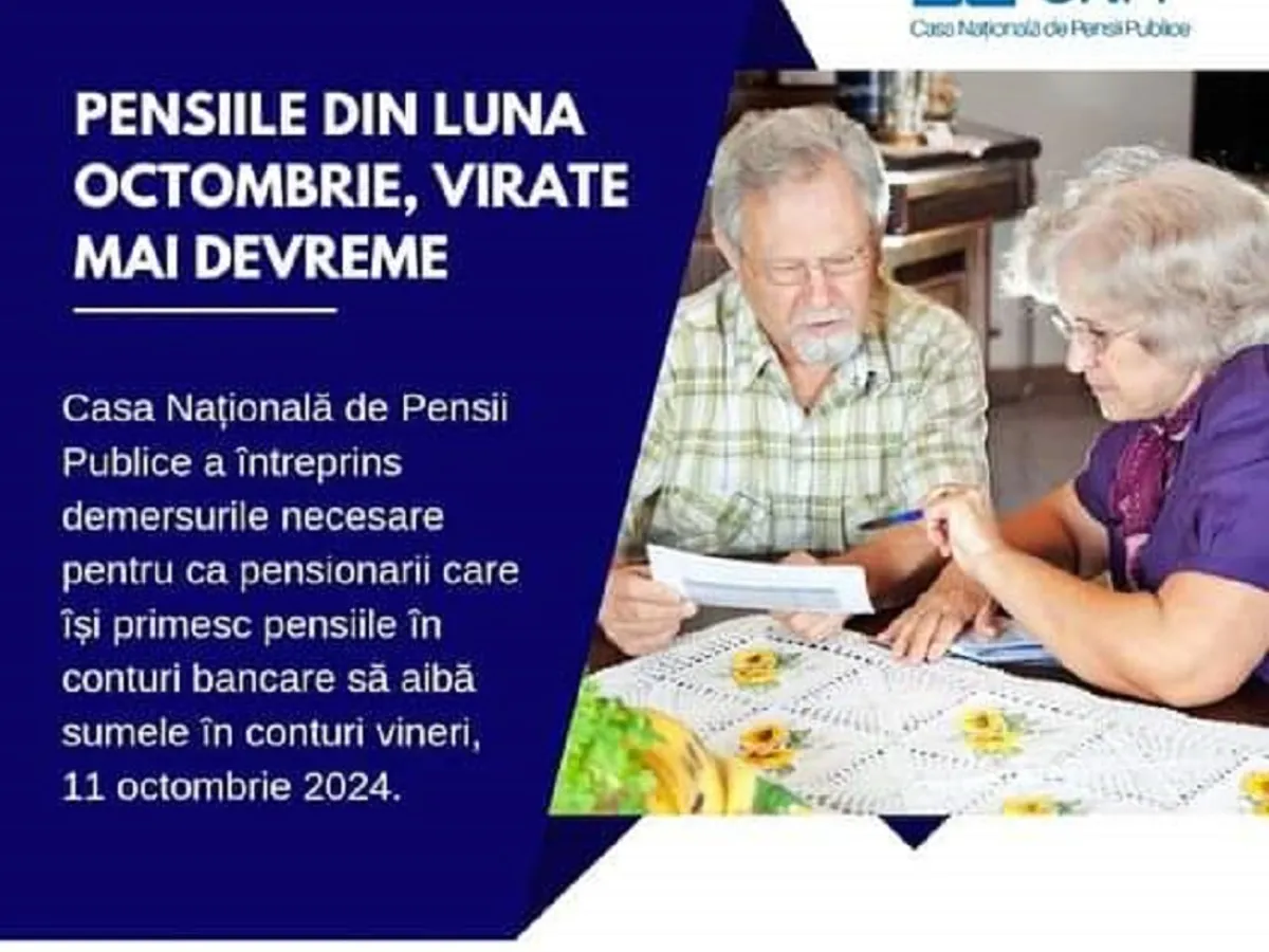 Avem confirmarea oficială. Pensionarii vor lua pensia pe luna octombrie în ziua de vineri pe 11 octombrie, mai devreme cu o zi. Pensiile se dau în zilele de 12 și 13 care sunt în weekend.