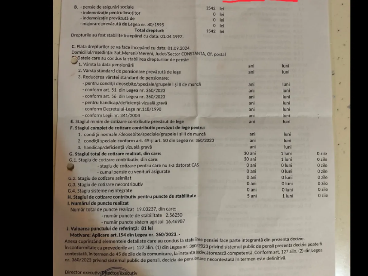 Respectivul pensionar a muncit 30 de ani. Ia bani în plus pentru că a primit puncte de stabilitate pentru cei 5 ani munciți peste 30 de ani. E vorba de 2,5 puncte de stabilitate la care s-au adăugat 16 puncte din sistemul agricol.