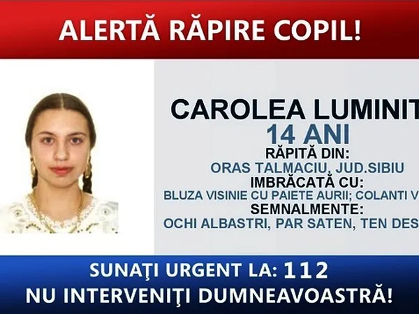 ”La data de 9 ianuarie a.c., în jurul orei 03.55, dispeceratul Inspectoratului de Poliţie Judeţean Sibiu a fost sesizat prin apelul unic de urgenţă 112, cu privire la dispariţia unei minore, CAROLEA LUMINIŢA, în vârstă de 14 ani.