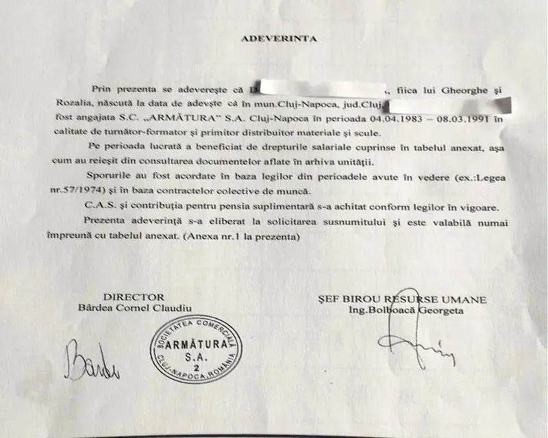 Din păcate, pensionarii care se află în această situație sunt foarte mulți. Spre exemplu, o pensionară care a fost angajată a S.C. „Armătura” S.A. și a lucrat între 4 aprilie 1983 și 8 martie 1991 ca turnător-formator și primitor distribuitor de materiale și scule.
