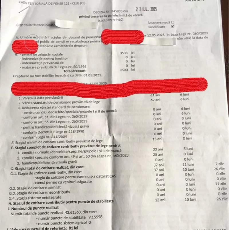Decizia emisă ulterior de Casa de Pensii (nr. 845833/22.07.2025) stabilește drepturile de pensie începând cu 31 mai 2021 la suma de 3.533 lei, fără nicio sumă suplimentară pentru indemnizații sau majorările prevăzute de lege pentru alte categorii.