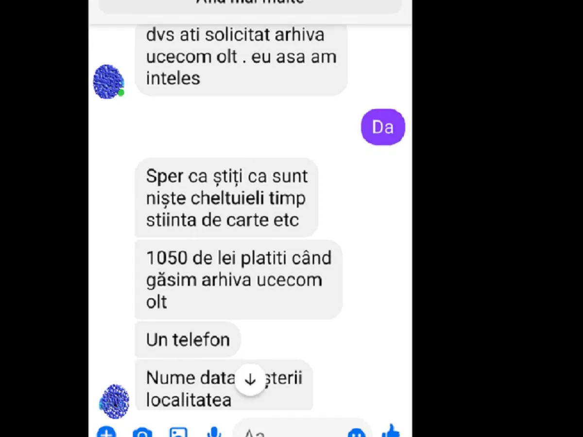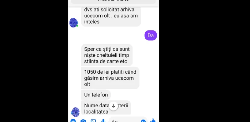 Și mie mi-a cerut unele date cu promisiunea că mă ajută cu o adeverinta de vechime de la o arhiva pierdută. Aveți grijă și poate se sesizează și poliția.