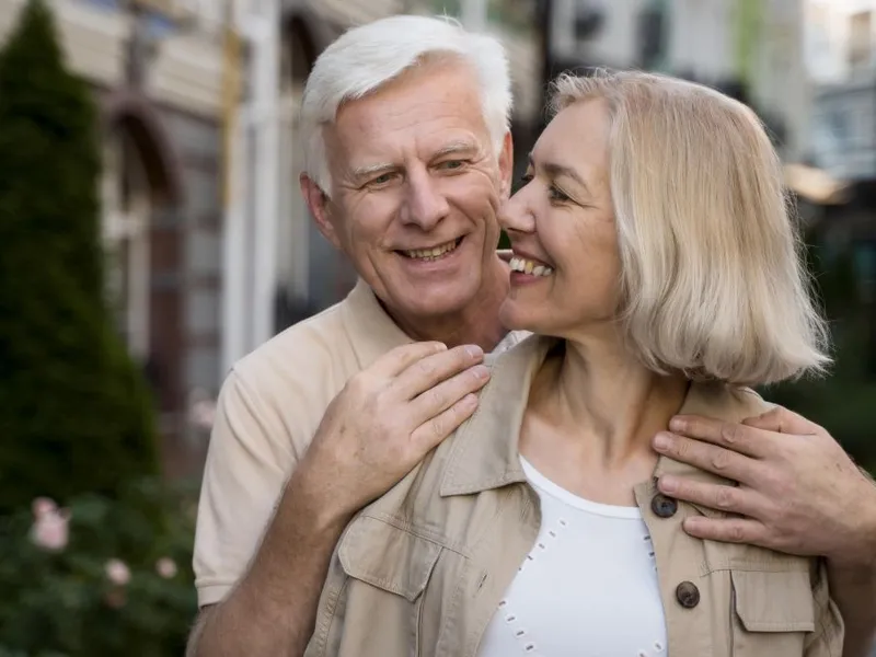 Cuplu în etate zâmbind, stând pe o bancă, în parc - Foto: Freepik/CC0