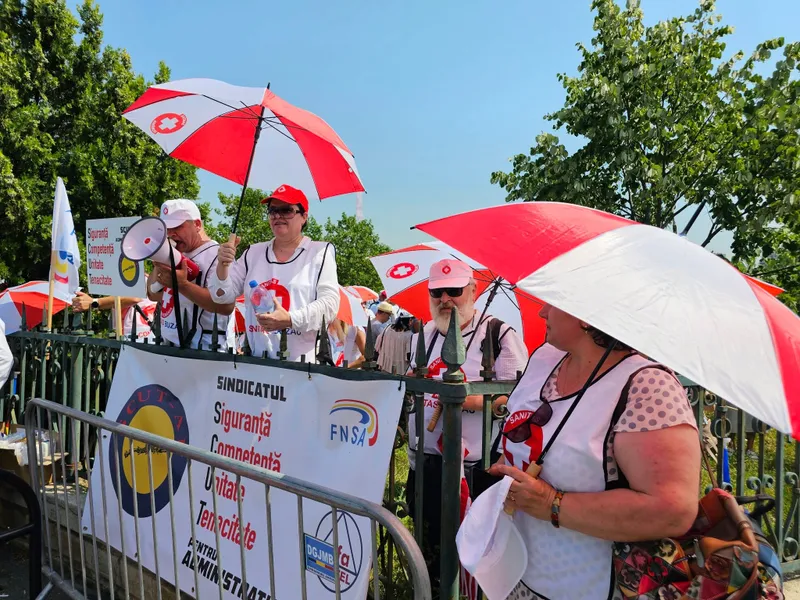 Sindicaliștii din Sănătate și Educație au ieșit în Parcul Izvor, de lângă Palatul Parlamentului. În același timp, protestele continuă și luni la Casele de Pensii.